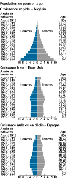 Comme le montre la figure 2, la structure par �ge de la population du Nig�ria est caract�ristique des pays connaissant une croissance rapide ; chaque cohorte est plus importante que la cohorte qui la pr�c�de, ce qui donne au sch�ma une forme pyramidale. Cette structure par �ge expansive est la cons�quence de taux de natalit� �lev�s. La population de l'Espagne, qui comporte des nombres � peu pr�s �gaux dans toutes les tranches d'�ge, est typique des populations d�croissantes ou quasiment stationnaires. La distribution de la structure par �ge de la population des Etats-Unis indique une population en expansion, mais � un taux plus faible que le Nig�ria.