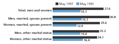 Source: Adults 25 to 55 years old. Linda Waite and Mark Neiben, The Rise of the Dual-Career Family 19631997. University of Chicago Working Paper Series, February 1999.