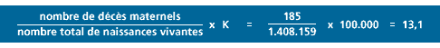Le rapport de mortalité maternelle est le nombre de femmes qui meurent des suites d'une grossesse ou d'un accouchement durant une année donnée pour 100.000 naissances vivantes durant cette année. Les morts provoquées par les complications des avortements spontanés ou des avortements provoqués sont incluses.