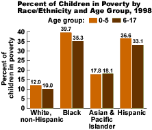 Some children are at greater risk of living in poverty than others. In 1998, 40 percent of black children under age 6 lived in poverty, compared with 12 percent of white children, 18 percent of Asian children, and 37 percent of Hispanic children in that age group. As shown in the adjacent figure, children ages 6 to 17 were at a slightly lower risk of living in poverty.