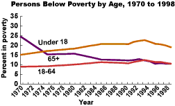 In 1970, nearly one-fourth of older Americans lived in poverty, more than twice the current rate of roughly 10 percent (see figure, upper right). Children, on the other hand, are worse off today than they were 30 years ago, despite a decline in child poverty over the past five years.