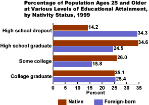 Public policy initiatives often stress education as a means of guaranteeing a well-paid, productive population. In general, a person with a college degree earns more money and has more employment opportunities than a person with only a high school degree or less. This pattern is of particular concern to immigrant communities. The adjacent graph shows the educational attainment of native-born and foreign-born populations. It shows that those born in the United States are more than twice as likely to have completed high school than the foreign-born. In contrast, the percentages of native-born and foreign-born people with college degrees are about equal. This reflects a dichotomy within the immigrant community: One group, highly skilled and college educated, can expect to compete with native-born Americans for well-paying jobs; the other group, consisting largely of less-educated migrant workers, cannot compete for the top jobs.