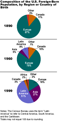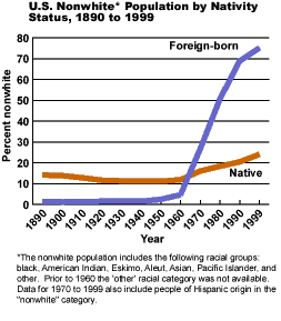 These shifts in patterns of immigration have resulted in a much more racially and ethnically diverse foreign-born population. In 1890, only 1.4 percent of the foreign-born population was nonwhite. By 1970, 27 percent of foreigners were nonwhite, and by 1999, 75 percent were nonwhite.