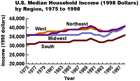 In 1998, median household income was highest in the West ($40,983),