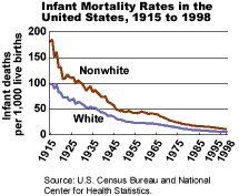 From the standpoint of American parents, the best news of the 20th century was the steady, long-term decline in the risk of death for infants and children. Around the time of World War I, one in 10 babies born in the United States died before age 1. The infant mortality rate for nonwhite infants approached 1 in 5. These rates are similar to those found today in some of the poorest countries of the world, such as Sierra Leone and Ethiopia. Today infant and child deaths are much less common. There are 7 infant deaths for every 1,000 babies born in the United States. In 1998, the death rate for children ages 1 to 4 was 0.3 per 1,000 population, down from 19.8 in 1900.