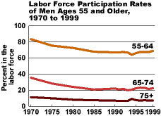 For older men, labor force participation rates have leveled off since the mid-1980s after decades of decline. Of those ages 55 to 64, 83 percent were in the labor force in 1970; 68 percent in 1985, and 69 percent in 1999. For those ages 65 to 74, labor force participation was 36 percent in 1970, and fell to 21 percent in 1985 before climbing somewhat to 23 percent in 1999.