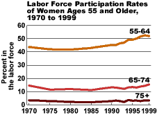 The trend in labor force participation for older women has been one of steady increase. Each successive generation in recent decades has had a higher proportion of women working outside the home during their middle years, gradually narrowing the gap in labor force participation rates between older men and older women. In 1999, 52 percent of women ages 55 to 64 and 15 percent of those ages 65 to 74 were in the labor force.
