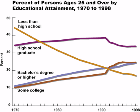 The percentage of the population ages 25 and over with less than a high school diploma declined from 44 percent in 1970 to 17 percent in 1998. Over the same period, the percentage of adults who completed at least some college has more than doubled, from 22 percent to 58 percent. Although the trend has slowed somewhat in recent years, the overall increase in