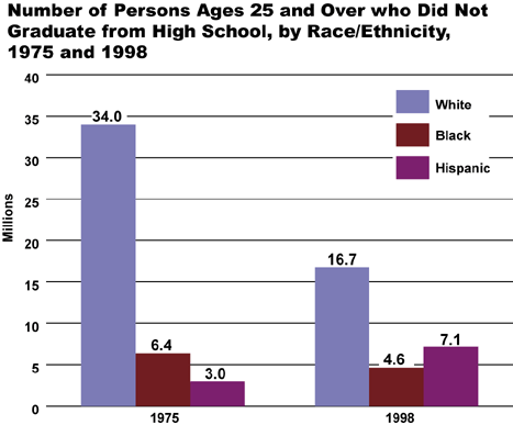 Hispanics have not advanced as quickly as other minority populations. The percentage of Hispanics with at least a high school diploma has increased over the past 25 years, but has not kept pace with the rapid growth of the Hispanic population as a whole. As a result, the number of Hispanics without a high school diploma has more than doubled over the past two decades, from 3 million in 1975 to more than 7 million in 1998.